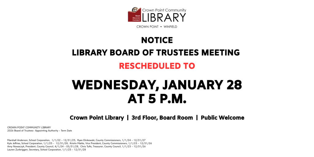 Question about the website? Email:webmaster@crownpointlibrary.org