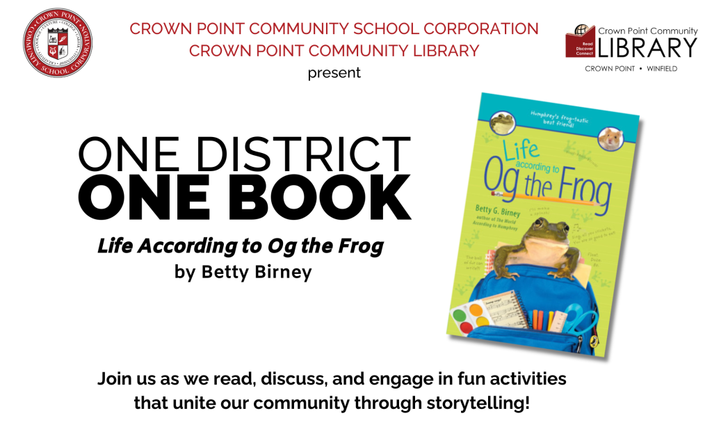 The Crown Point Community School Corporation and the Crown Point Community Library are excited to hop into this year’s One District, One Book selection: Life According to Og the Frog by Betty Birney!