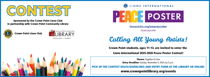 The Crown Point Lions Club, in partnership with the Crown Point Community Public Library, invites students ages 11–13 to participate in the 2025-2026 Lions International Peace Poster Contest.