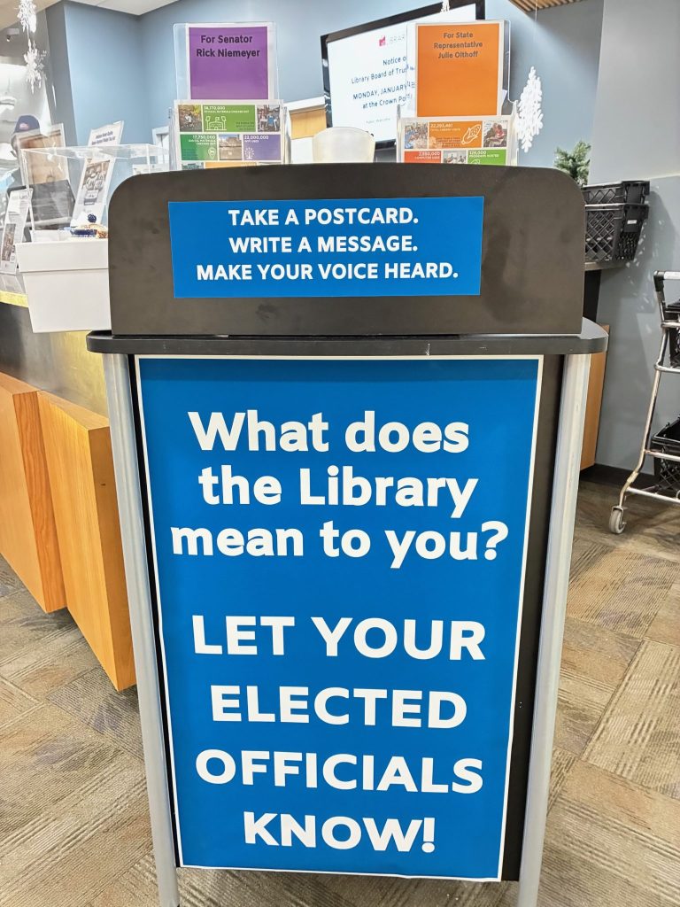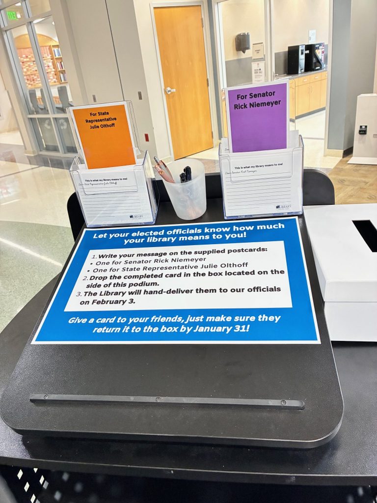 - Stop by the library and write a message on the provided postcards for Senator Rick Niemeyer and State Representative Julie Olthoff.