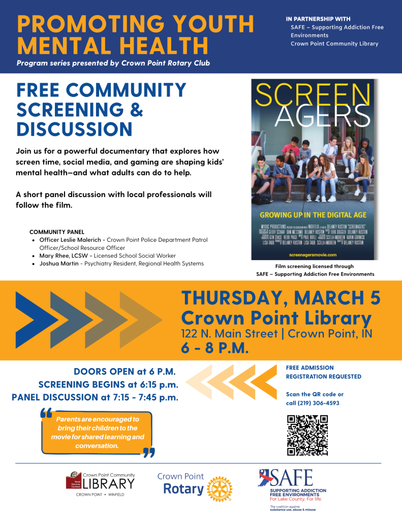 The Crown Point Rotary Club has identified youth mental health as a key initiative and established a Youth Mental Health Committee to address the challenges facing today’s young people. As part of the Rotary’s ongoing Youth Mental Health Series, the Club is partnering with SAFE – Supporting Addiction Free Environments and the Crown Point Community Library to bring educational programming to the community.