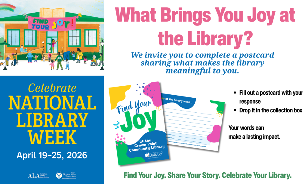 In celebration of National Library Week 2026, the Crown Point Library invites the community to participate in our “Share the Joy” Postcard Campaign, inspired by this year’s theme: Find Your Joy.