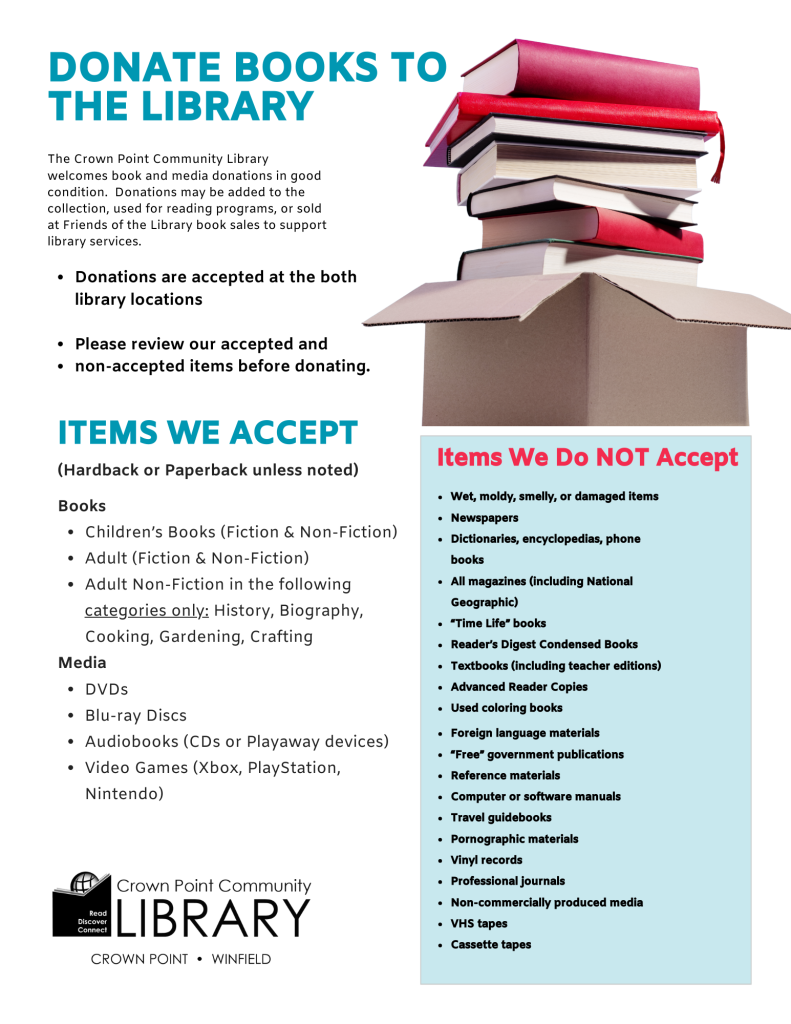 Your library means more than books—it’s a place for connection, learning, and inspiration. One of the best ways to support everything the Crown Point Community Library offers is by joining the Friends of the Crown Point Library. The Friends are a dedicated group of volunteers who advocate for and raise funds to enhance library programs, services, and events. From sponsoring summer reading prizes to funding special projects, the Friends help make the library a vibrant part of our community. Membership is open to all individuals and families who want involvement in the library. Members are encouraged to attend meetings and to actively participate in book sales, other events, and projects. The membership year begins on January 1 and ends on December 31. All dues are paid annually.