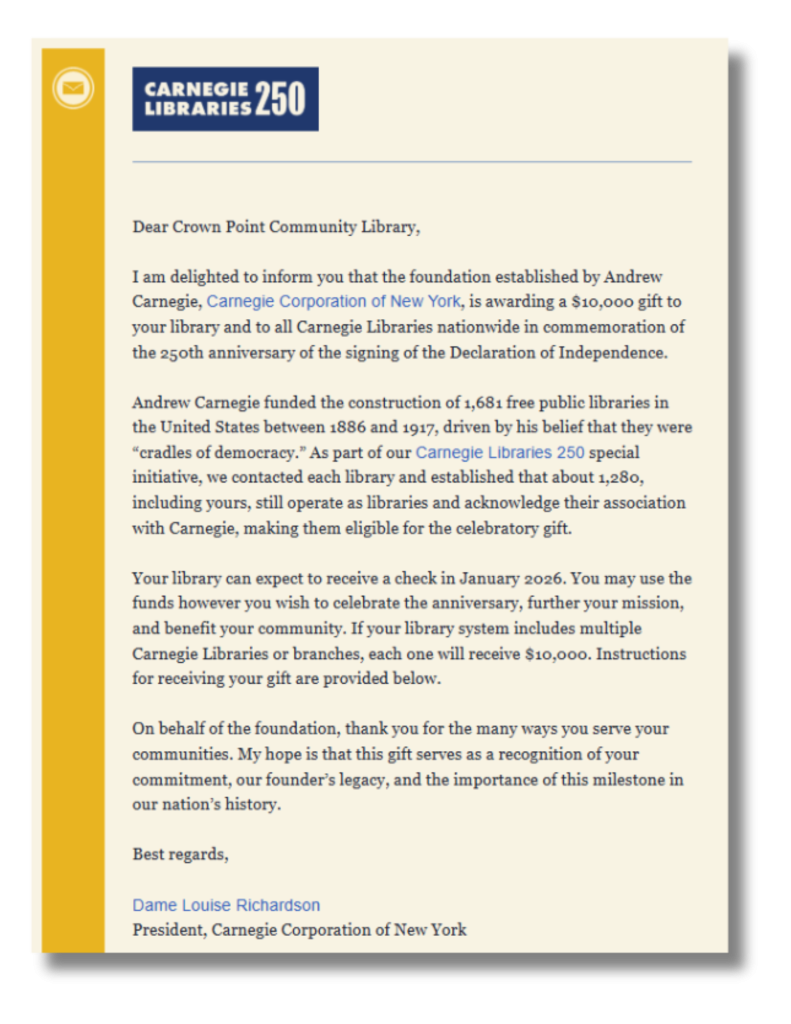 “We are deeply honored to be recognized by the Carnegie Corporation of New York and to receive this generous gift as part of the Carnegie Libraries 250 initiative. The Crown Point Community Library’s roots as a Carnegie Library are a meaningful part of our community’s history, and this recognition reminds us of the enduring legacy of Andrew Carnegie’s vision for free and equitable access to knowledge. This gift will help us celebrate that legacy while continuing to invest in the Library’s programs, resources, and connections that strengthen our community today,” said Julie Wendorf, Library Director.