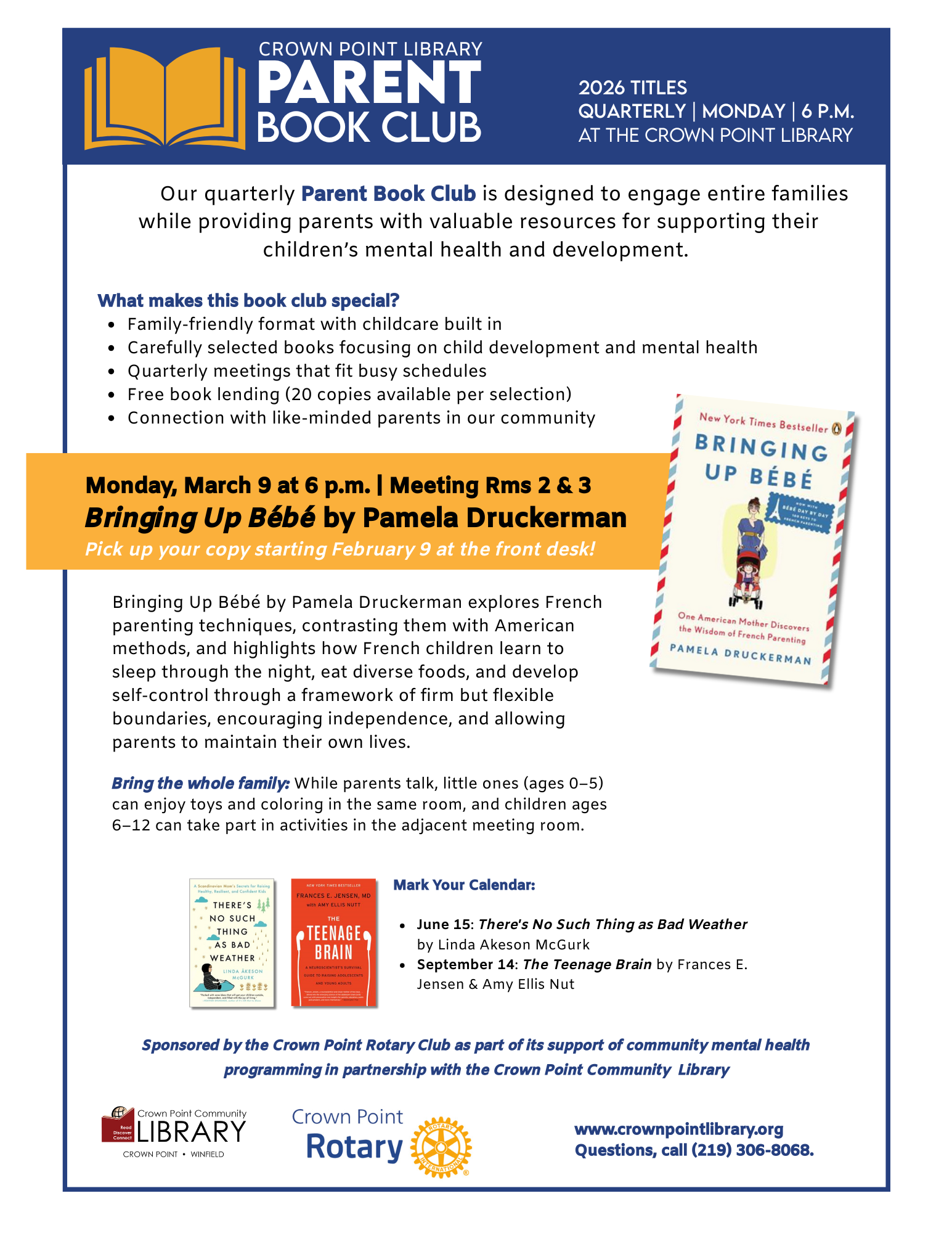 The Crown Point Community Library is excited to introduce the Parent Book Club, a quarterly discussion group designed to support parents and caregivers. This series invites families to engage with the Library’s resources while exploring parenting topics that promote mental health and well-being for children of all ages.
